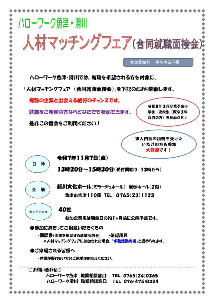 2025/09/26 お知らせ 【ハローワーク魚津・滑川】11月7日(金)人材マッチングフェア(合同就職面接会)開催します。 【参加対象者】 ・就職を希望される方。 ・令和7年度3月卒業予定の学生・高校生(既卒3年以内の方)