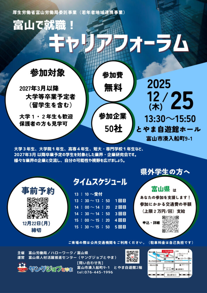 2025/11/04 お知らせ 【ヤングジョブとやま】12月25日(木)富山で就職!キャリアフォーラムを開催します。 【参加対象者】 ・2027年3月以降大学卒業予定者(留学生を含む) ・大学1・2年生も歓迎、保護者の方も見学可 事前予約・詳細はこちら