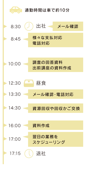 入庁して良かったことは、家から職場まで10分で着くこと。また、課によりますが、毎月積み立てをして秋に課内旅行に行くことがあります。優しくて面白い職員さんが多いので、とても楽しいですね。名水マラソンや選挙関連、課の仕事でたまに土日出勤があることも入社して知りました。土日出勤は、残業扱いもしくは振替休日を取ることになりますし、普段もお休みを取りやすい雰囲気があるのでとても働きやすい環境です。